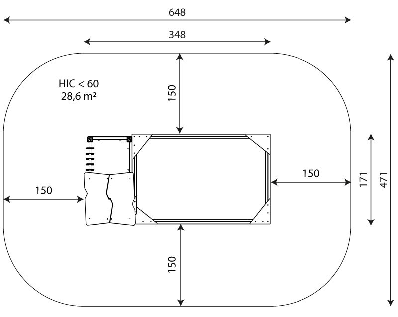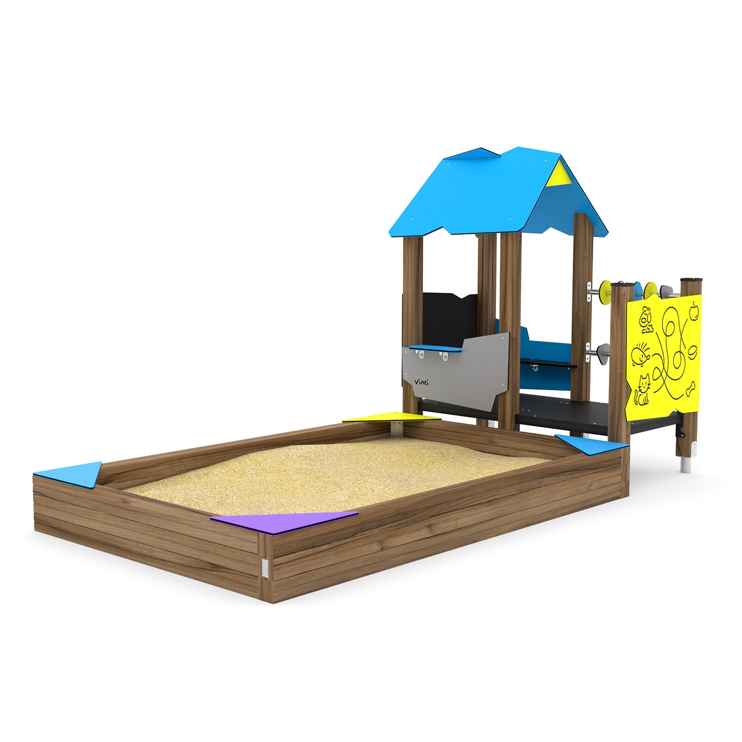 Viihtyisä leikkikatos hiekkalaatikolla. Tarkoitettu 1-12 -vuotiaille. Valmistettu liimapuusta, levyosat HDPE levyä. Turva-alustana vähintään hyvin hoidettu pintamaa. Tilan tarve 6,48 x 4,71 m.