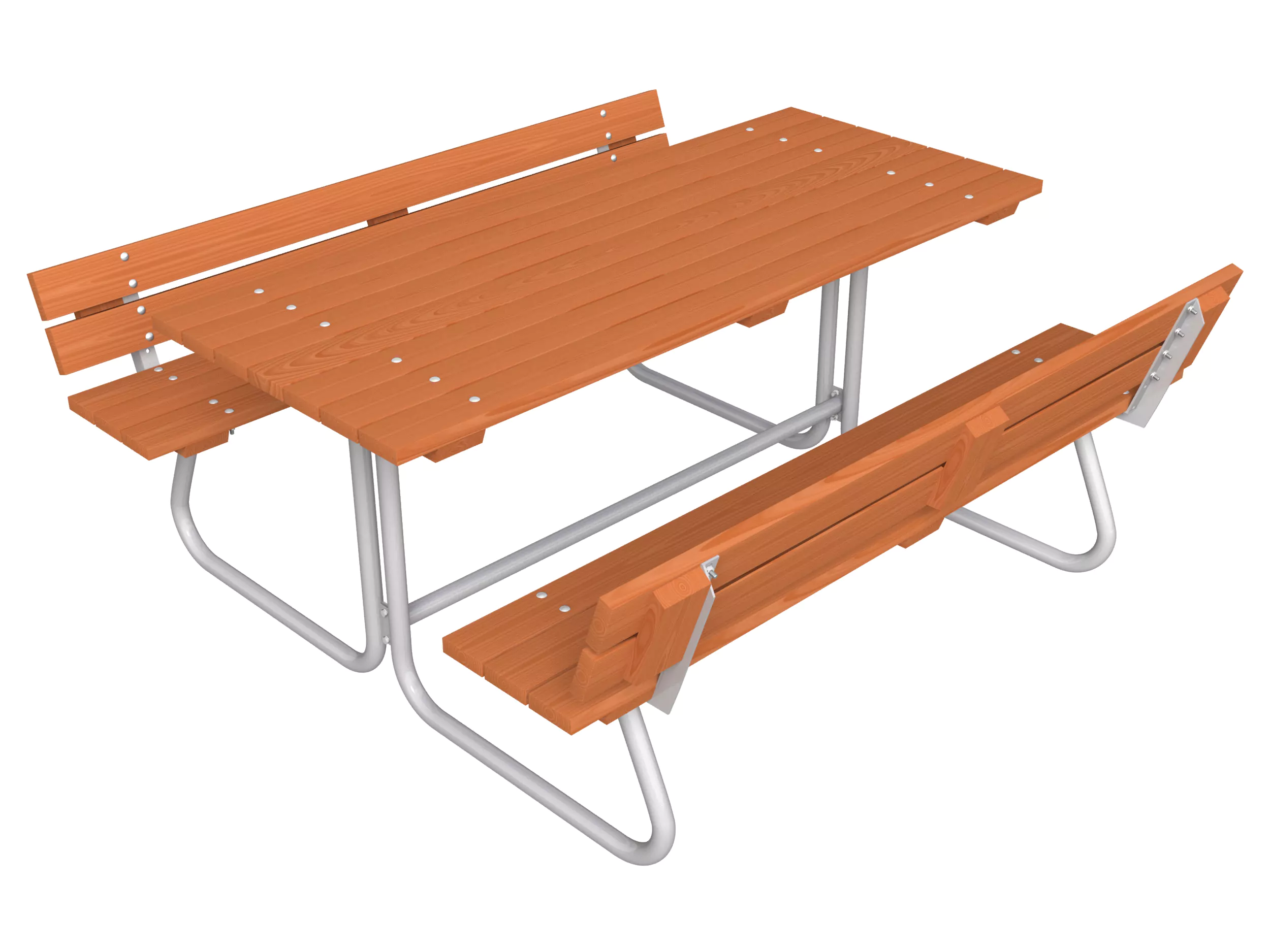 Runko kuumasinkitty. Istuin- ja pöytätasot sekä selkänoja huoltovapaasta kierrätysmuovilankusta. Istuintason ja pöydän leveys 1,7 m. Pöydänkannen korkeus 75 cm, istuinkorkeus 45 cm. TÄSSÄ VÄÄRÄ KUVA